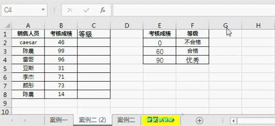 分析:因为销售量350时,数据会在D列进行模糊查找,如果没有找到350,则会进行匹配 小于350且跟350最接近的数据,从图表中可以看到,销售量325满足需求,因此返回亚斯;同理,当销售量为352时,返回李杰。