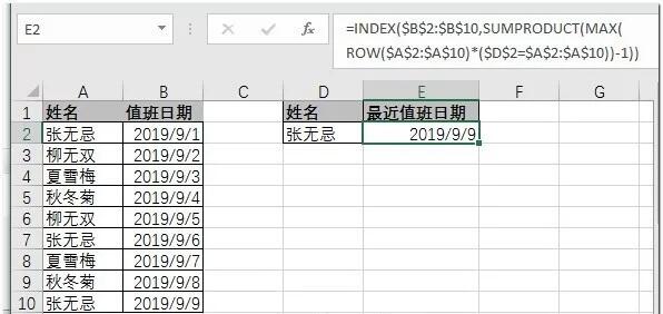 公式先比较单元格D2中的值与单元格区域A2:A10中的值,如果相同返回TRUE,不相同则返回FALSE,得到一个由TRUE和FALSE组成的数组,然后与A2:A10所在的行号组成的数组相乘,得到一个由行号和0组成的数组,MAX函数获取这个数组的最大值,也就是与单元格D2中的值相同的数据在A2:A10中的最后一个位置,减去1是因为查找的是B2:B10中的值,是从第2行开始的,得到要查找的值在B2:B10中的位置,然后INDEX函数获取相应的值。之所以使用SUMPRODUCT函数,是因为该函数可以处理数组公式,而无须在公式输入完成后按Ctrl+Shift+Enter组合键。