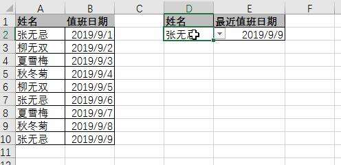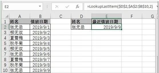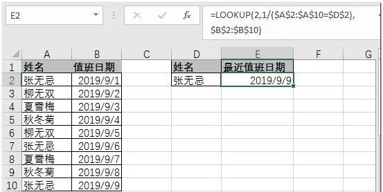公式中,比较A2:A10与D2中的值,相等返回TRUE,不相等返回FALSE,得到由TRUE和FALSE组成的数组,然后使用1除以这个数组,得到由1和错误值#DIV/0!组成的数组,由于这个数组中找不到2,LOOKUP函数在数组中一直查找,直至最后一个比2小的最大值,也就是数组中的最后一个1,返回B2:B10中对应的值,也就是要查找的数据在列表中最后的值。
