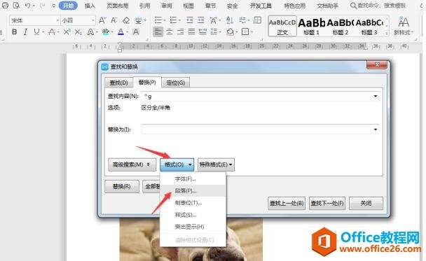 将光标点击【替换为】的输入框内,点击【格式】-【段落】。