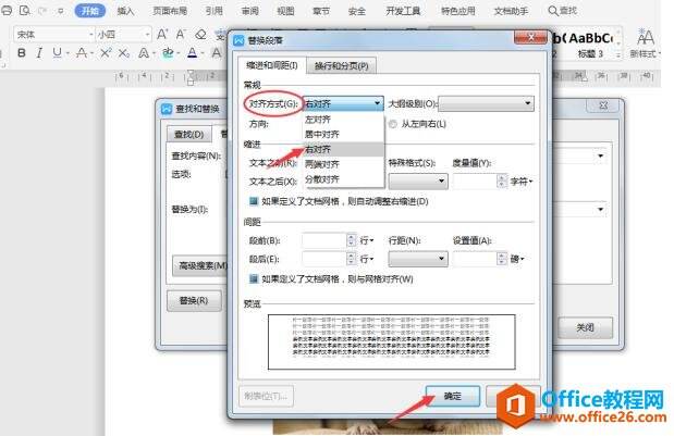 会弹出【查找段落】的对话框,在【对齐方式】中选择【右对齐】,再点击【确定】。