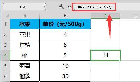 在C4单元格输入=AVERAGE(B2:B6),结果显示平均数为11。