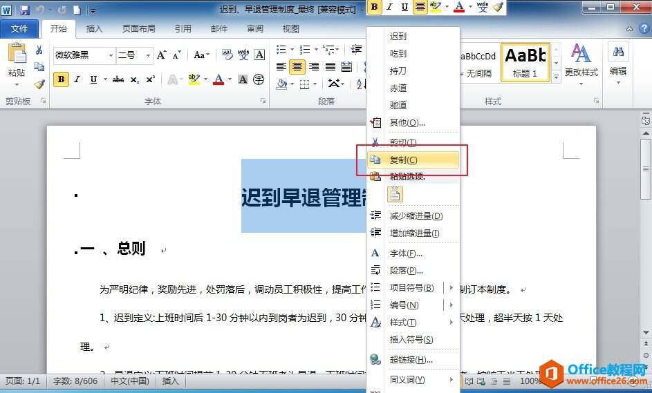 方法3:选择文本“迟到早退管理制度”,然后按下组合键【ctrl】+【c】即可。