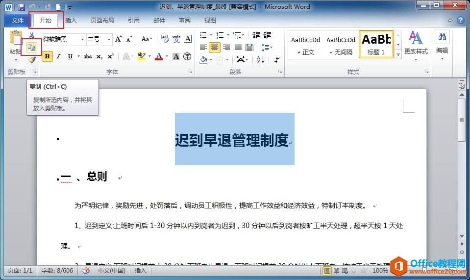 方法2:选择文本“迟到早退管理制度”,然后切换到【开始】选项卡,在【剪切板】组中单击【复制】按钮。