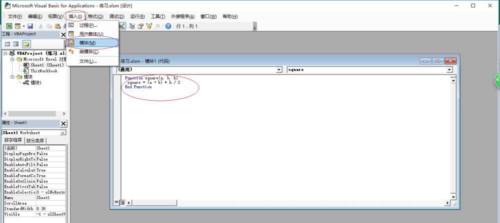 Applications"窗口,如图所示。选择"插入→模块"菜单,弹出代码编辑窗口输入自定义函数脚本。