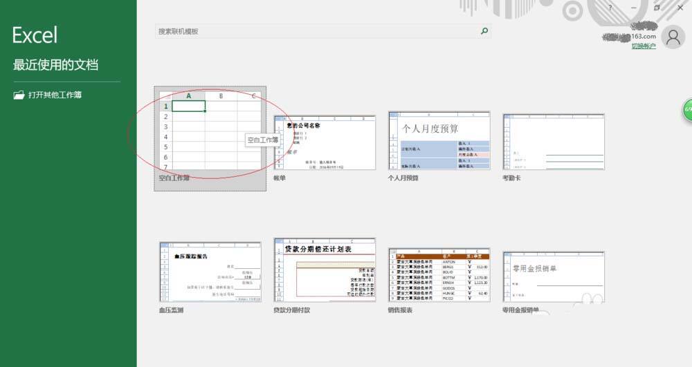 启动excel 2016电子表格应用程序,如图所示点击屏幕右侧新建空白工作簿。