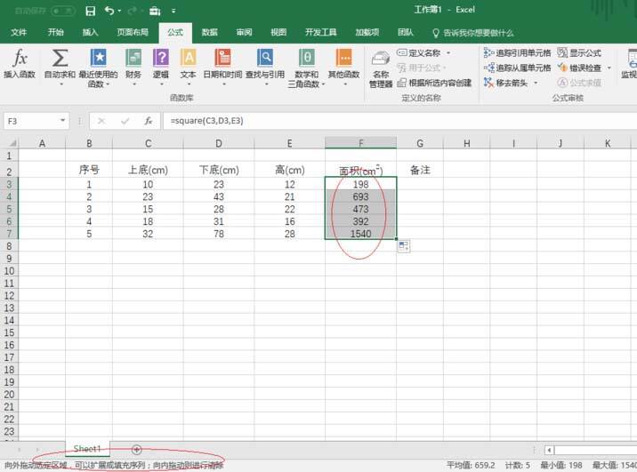 如图,拖动选定区域进行序列填充。完成自定义函数求梯形面积的操作,本例到此结束。