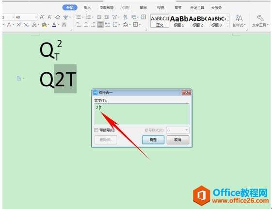然后弹出双行合一的文本框,在2和T中间打一个空格,然后单击确定。