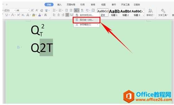然后选中2和T,单击工具栏开始下有一个小标识,如下图的位置,在下拉菜单中选择双行合一。