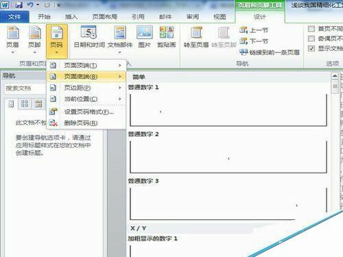 接着单击“插入”看到页眉和页脚栏,单击“页脚”插入一个页脚,插入后单击导航栏的“连接到前一条页眉”你会发现“右下角的”与前一页相同“不见了,代表着可以与前一页不用了