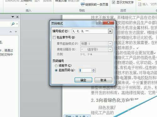 然后插入页码,再来单击页码的下拉按钮,选择”设置页码格式“,然后弹出一个对话框,在页码编号处选择起始页码,从1开始,然后确定即可。最后单击”关闭页眉页脚“,完成。