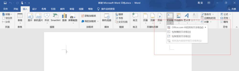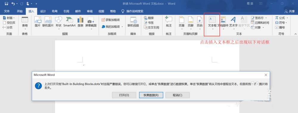 2、这里以插入文本框为例,点击插入“文本框”,此时出现打开“Built-In Building Block.dotx”出现严重错误对话框