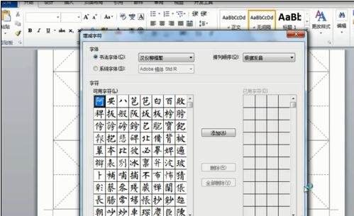 4、在”可用字符“列表框中选择需要加入字帖的汉字,单击”添加"按钮将其加入到字帖中,再单击“关闭”按钮关闭该对话框。