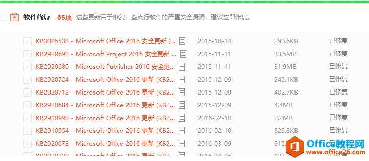于是在360中查询了一下更新补丁,结果发现去65个更新,全是关于Office,于是更新了一下。