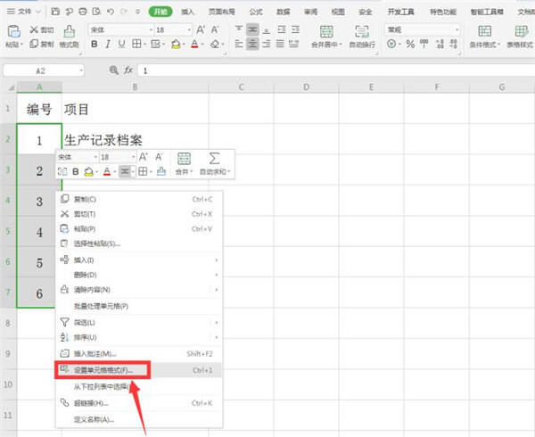 选中编号一栏,右键弹出菜单,点击【设置单元格格式】: