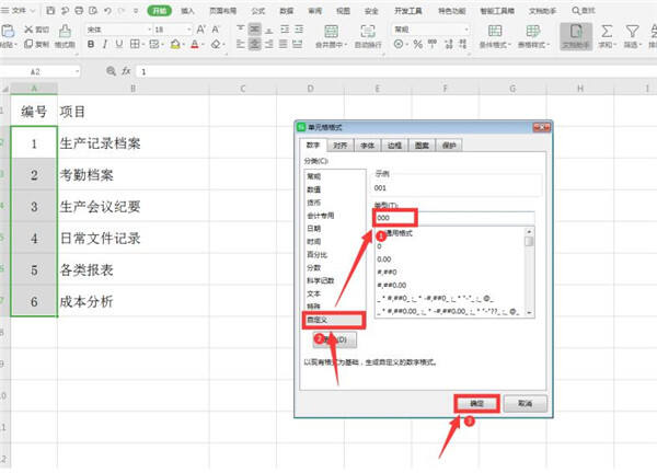 在弹出的【单元格格式】对话框中,选择【数字】选项卡下的【自定义】,在类型中输入“000”: