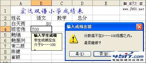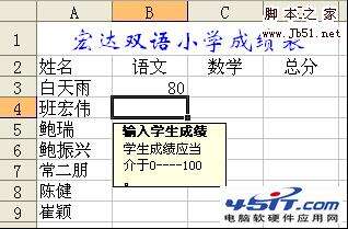 假设试卷的满分100分,因此学生的成绩应当介于0—-100分之间的。我们可以通过以下几步使我们录入成绩时保证是0—-100分之间,其它的数据输入不能输入。