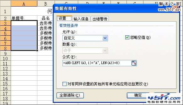如果用户为了统一产品编号的输入,要求录入者只能输入8位的字母“A”开头的编号,同样也可以通过“数据有效性”来进行控制,设置步骤如下: