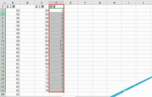 8、进行频度统计。首先选中与总工期相对应的频度下面的单元格D2:D23,然后输入公式“=FREQUENCY(A2:A101,C2:C23)”,然后按下Ctrl+Shift+Enter。如此会计算出模拟出来各个总工期的发生次数。