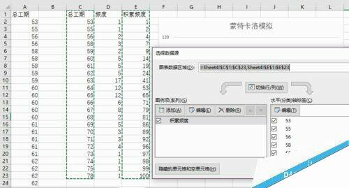 在添加的空白折线图上右键“选择数据区域”: 数据区域即总工期和积累频度两列。由于我们并不需要总工期呈现为曲线形式,在选择后的对话框中,将总工期删除,只保留累计频度。