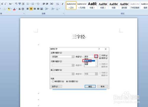 4、弹出对话框,打开主要关键字下拉菜单,选择段落。