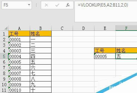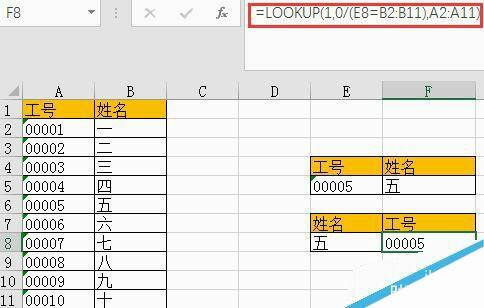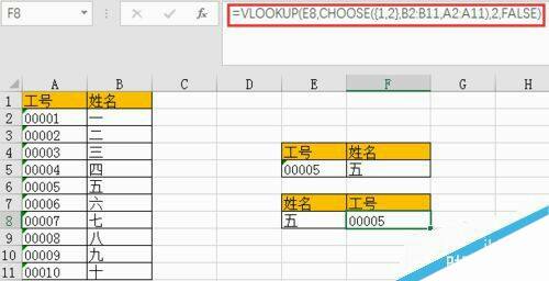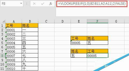逆向查找的第一种方法同样是利用vlookup函数,搭配if函数重新构建个数组来使用。这个公式的用法是利用if({1,0},B2:B11,A2:A11)返回一个姓名在前,工号在后的多行两列的内存数组,这样它就符合vlookup函数的查找值在首列的要求,可以顺利进行查找了。