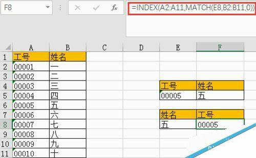 =INDEX(A2:A11,MATCH(E8,B2:B11,0))。公式首先使用match函数E8单元格姓名在B2到B10单元格中的相对位置5,也就是这个区域所在第几行,再以此作为index函数的索引值,从A2到A11单元格中返回对应位置的内容。这个公式看似繁琐,实际在查询时其组合灵活多变,可以完成从左到右,从上到下等多个方向的查找。