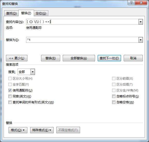 [《》\(\)()< ] :中括号里面是需要查找替换的内容,表示要查找的这些符号。(勾选【使用通配符】后生效。)