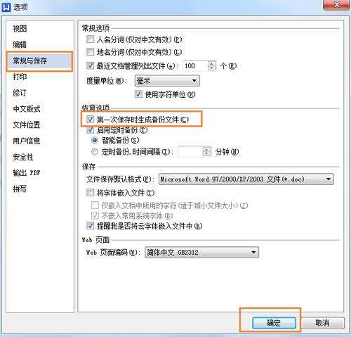 4、在弹出的方框中,点击【常规与保存】,可对备份功能进行设置。