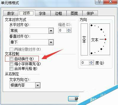 5、因要单元格中自动换行,那么在文本控制中,”自动换行“勾选上,然后点击“确定”即可。