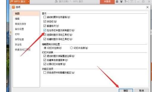 六、在“视图”选项的右侧窗格中,找到“显示”组中的“在任务栏中显示所有窗口”选项,并将其勾选,然后再点击“确定”按钮即可。