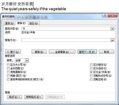 “替换为”选框保持空格无内容(因为我们目的是要删除英文内容,而空格就是表示无无内容),然后点击全部替换。