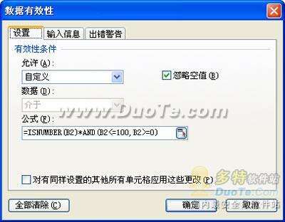 公式的含义:ISNUMBER(B2)表示它必须是一个数字,AND(B2=100,B2=0)表示数据必须在0到100之间;在两个条件中与*的联系意味着两个条件必须同时满足。