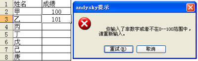 测试:在B2: B11区域输入大于100或小于0或“ABC”的数据,系统会弹出提示,阻止您的输入。从而确保成绩录入范围的准确性(见图3)。