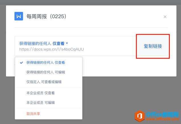 (2)在弹出的对话框中点击「复制链接」,你也可以对文档的操作权限进行设置。设置完之后,将文档链接分享给微信好友,对方打开链接就能查看/编辑文档了: