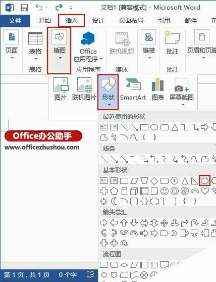 Office办公助手(www.officezhushou.com)提醒您:大家在画图过程中需要的各种图形和线条,都可以在“插入”选项卡中“插图”组下的“形状”中进行选择。