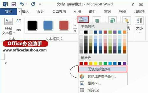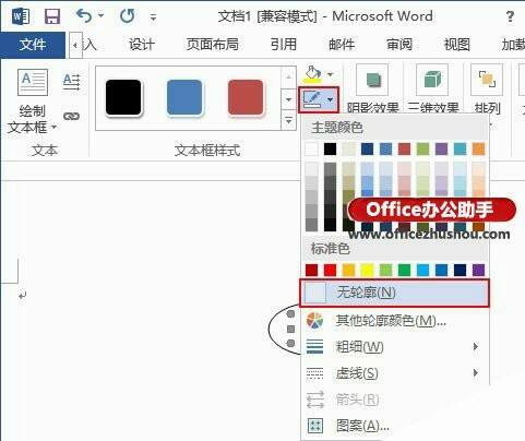 5、在调整好文本框的大小和位置后,双击文本框可以切换到“文本框工具->格式”选项卡,我们在“文本框样式”栏中单击“形状轮廓”按钮,选择“无轮廓”,然后单击“形状填充”按钮,选择“无填充颜色”。