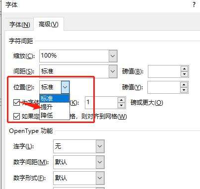 3、点开后,再点击字体的高级选项。找到位置,改成提升。
