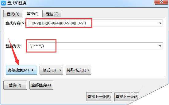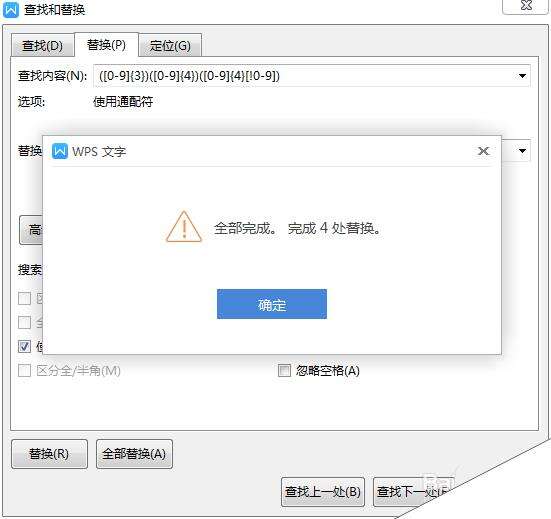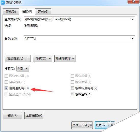 4、把下面的使用通配符勾选上,然后点击全部替换