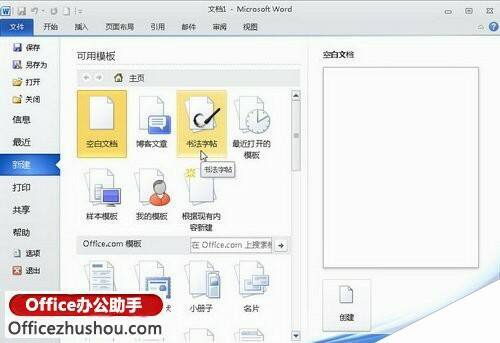 打开“新建”命令面板,用户可以看到丰富的Word 2010文档类型,包括“空白文档”、“博客文章”、“书法字帖”等Word2010内置的文档类型。用户还可以通过Officezhushou.com提供的模板新建诸如“会议日程”、“证书”、“奖状”、“小册子”等实用Word文档,如图所示。