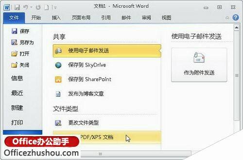 打开“共享”命令面板,用户可以在面板中将Word 2010文档发送到博客文章、发送电子邮件或创建PDF文档,如图所示。
