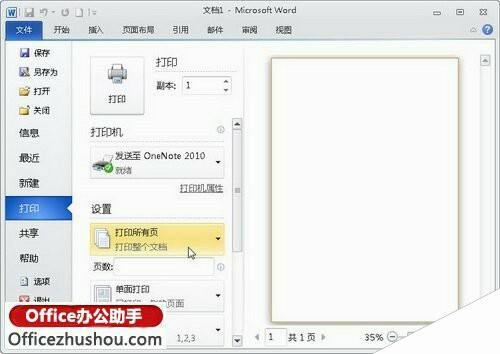 打开“打印”命令面板,在该面板中可以详细设置多种打印参数,例如双面打印、奇偶页打印、指定打印页等参数,从而有效控制Word 2010文档的打印结果,如图所示。