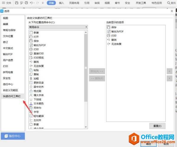 在弹出来的界面中找到【快速访问工具栏】并点击,如下图所示。