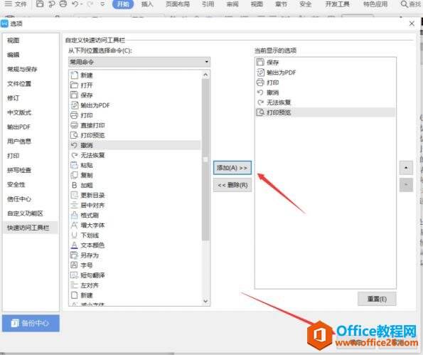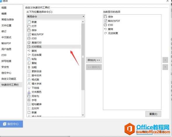然后点击【添加】,这时候右边的选项框中就会出现【打印预览】这一选项,最后点击【确定】,如图所示。