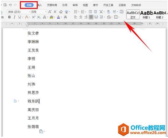 首先我们在WPS文档中输入所有人员名单,单击开始,打开段落快捷键。