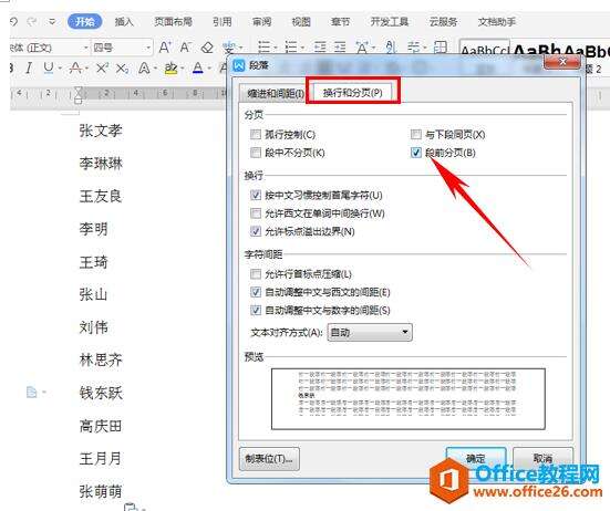 然后单击“换行和分页”选项,在分页的选项下勾选段前分页,然后单击确认。