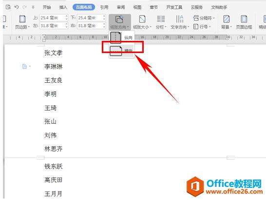 然后单击工具栏页面布局下的纸张方向,在下拉菜单中选择横向。将纸张调整为横向显示。