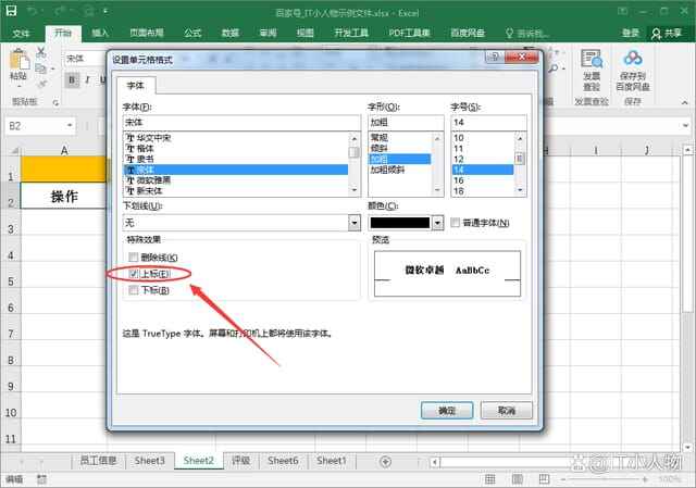 3、在“设置单元格格式”界面中点击【上标】,这样数字“3”就变成了上标,立方米的符号录入完成;