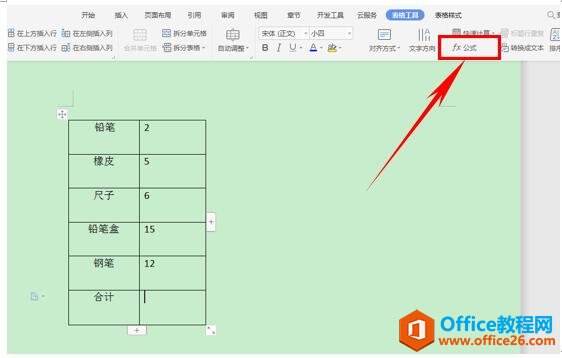 单击合计旁边的方框,然后出现工具栏出现一个表格工具的选项,我们在表格工具下选择fx公式。