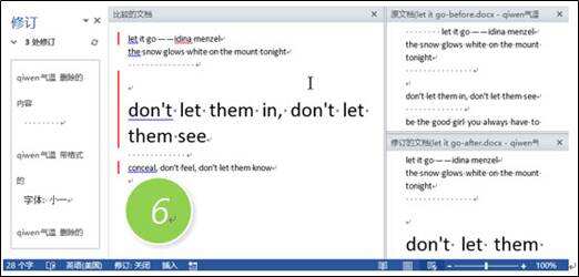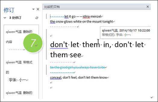 新打开的界面看上去有点复杂,这里需要关注红线的位置。单击红线可以看到,在原文档上到底修改了哪些内容,效果如下图所示(注意红线变成灰色,在单击又变成红色)。